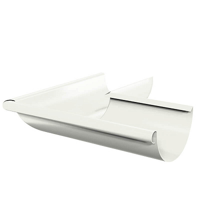 Угол желоба водостока наружный 90 градусов d125мм RAL 9010 Белый металлический - используется для надежного сопряжения двух желобов между собой на углах 90 градусов карниза кровли. Угол желоба изготовлен без сварных сопряжений, методом прессования (глубокая вытяжка), что придает ему дополнительную коррозийную и механическую стойкость.